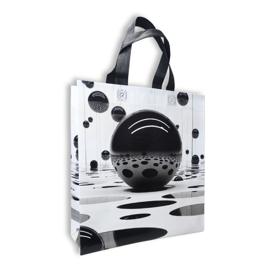 A small spunbond bag with a "Black balls" print and glossy lamination. Capacity - 9.5 litres. Suitable for everyday needs as well as for gift packaging. Laminated bags are practical, reliable, durable, and vibrant. Unlike paper or polyethylene bags, they last much longer. The printing method allows for the application of high-quality images. Whether glossy or matte, the lamination gives the spunbond water-resistant properties and enhances its characteristics.