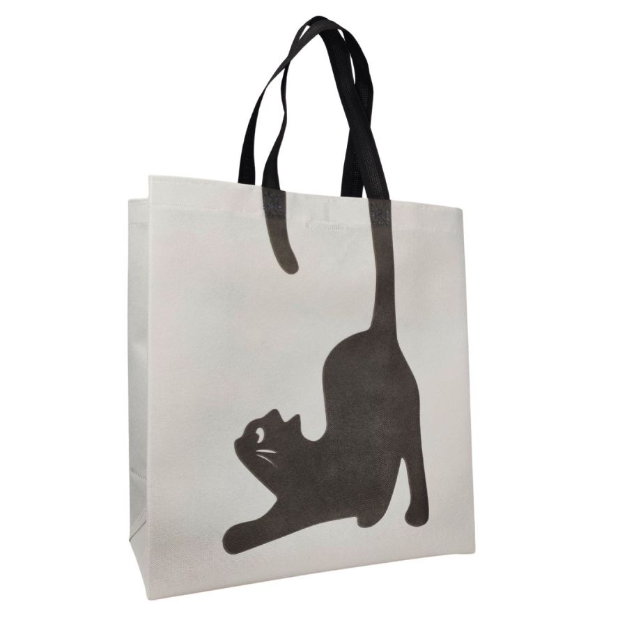 A voluminous eco-friendly bag made from spunbond material with a 'Cat with a tail' print. It has a capacity of 22.4 litres. Suitable for any purpose. You can take it shopping or to your workouts. This format is also suitable for product packaging; for instance, it can perfectly fit a medium-sized shoebox. These bags are extremely convenient for daily use: very spacious, lightweight, non-stretching, wrinkle-resistant, space-saving, colourfast, and non-static.